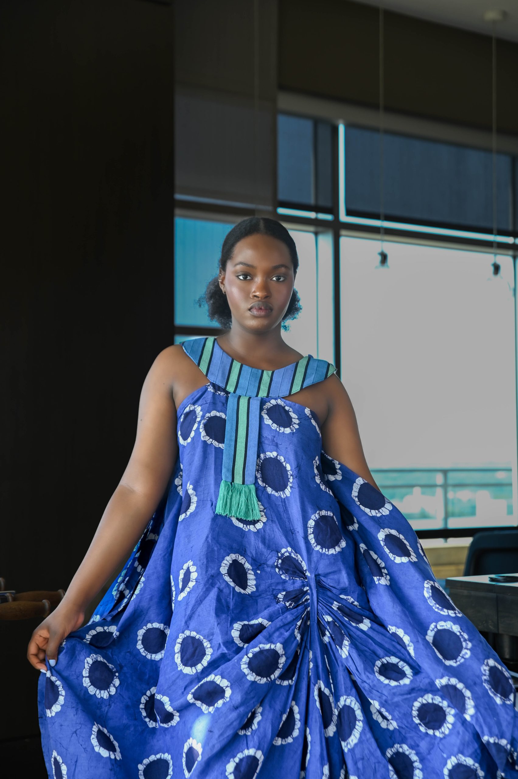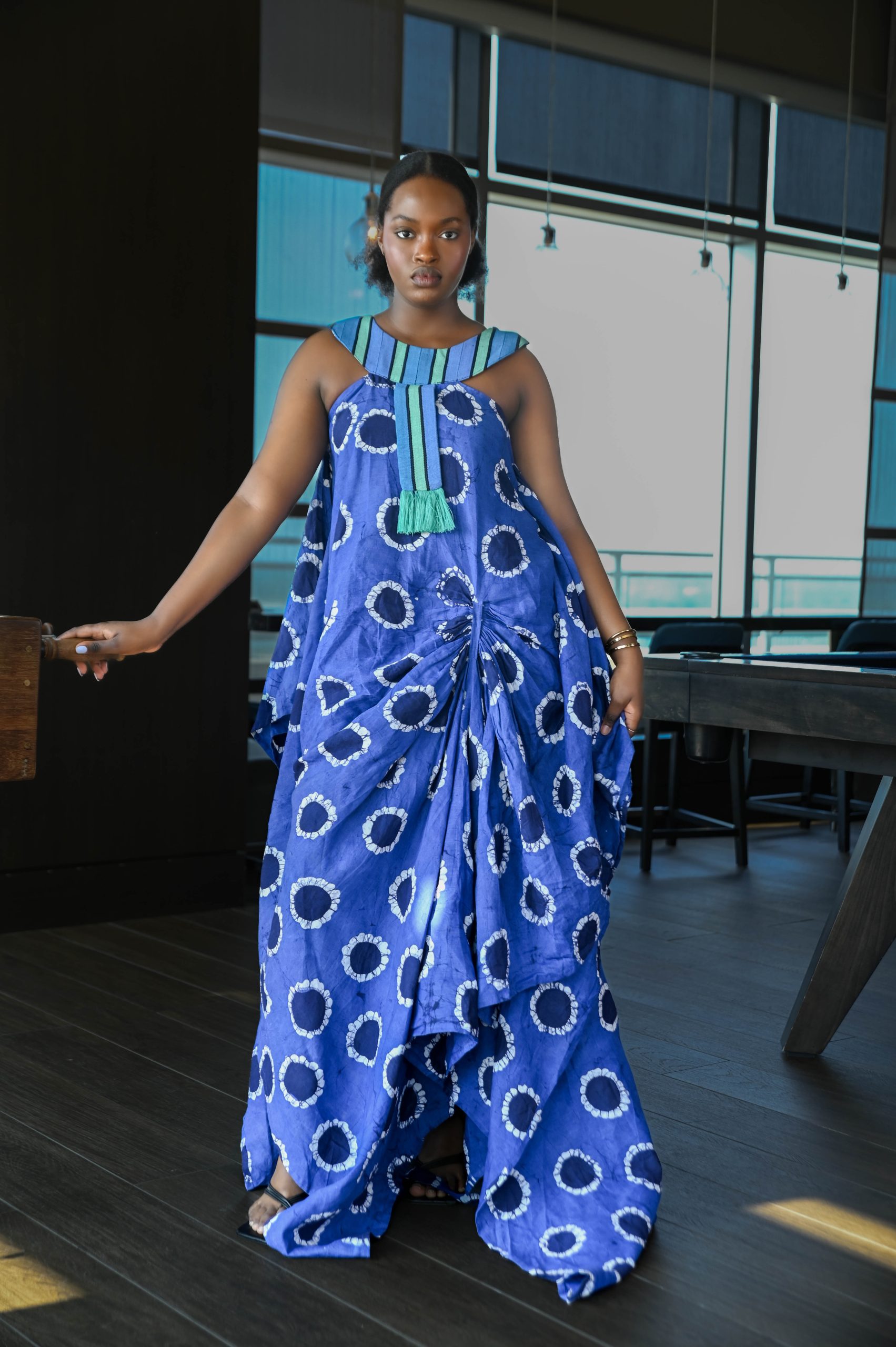 Batik Adire linen kaftan with Asooke halter neck and thread tassels.
